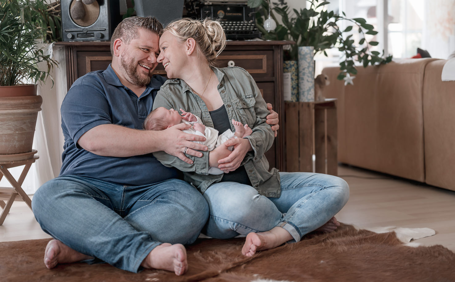 Keine fremde Umgebung, kein Studio – sondern genau der Ort, an dem das neue Leben gerade passiert. Zwischen Sofa, Bett und ganz viel Nähe entstehen Bilder, die nicht gestellt sind, sondern einfach passieren.