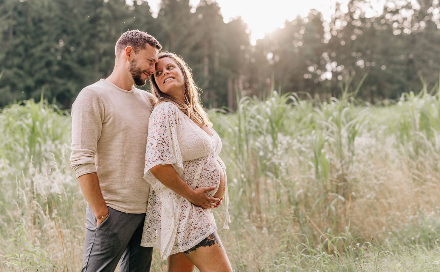 Neben dem kleinen Waldabschnitt hatten wir noch ein schönes Getreidefeld ums Eck, das wir natürlich auch für ein paar romantische Abendsonnefotos genutzt haben. Da die 2 auch noch einen Hund haben, wurde sich kurz umgezogen und dann haben wir ein Bauchfoto mit Hund gewagt – der Große war sehr aufgeregt, was da mit seiner Mama passiert.