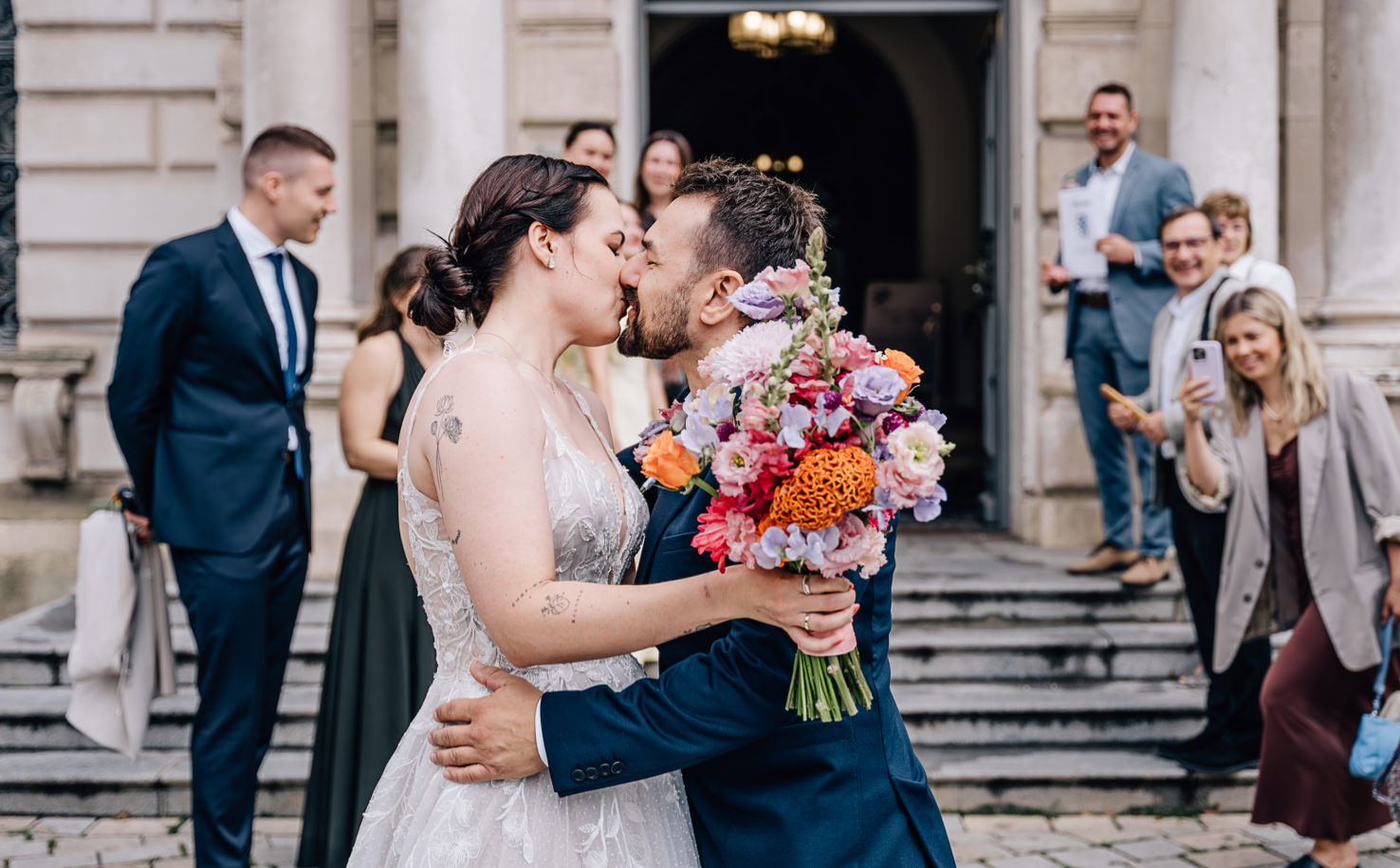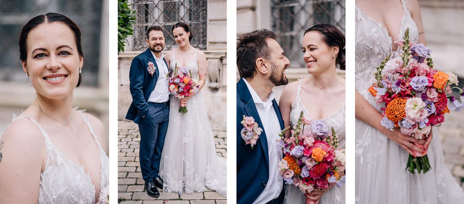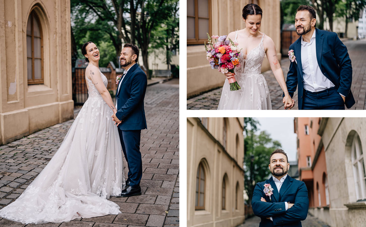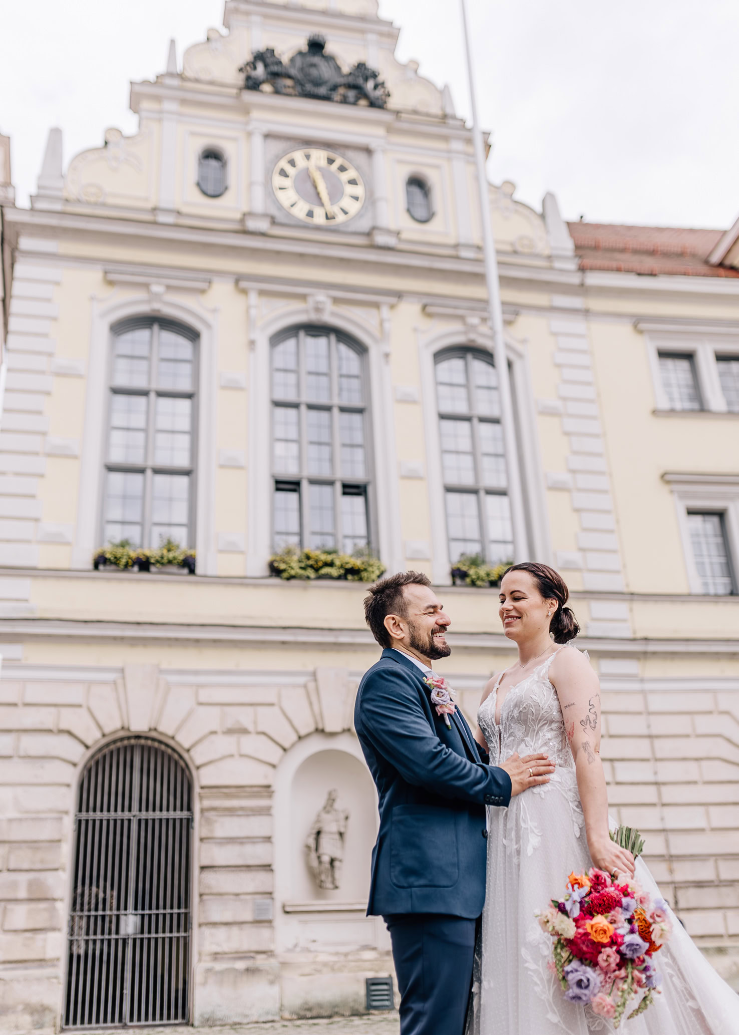Nach erfolgreichem „Ja“ wurde erstmal ausführlich gratuliert. Und dann nutzten wir die anhaltende Regenpause für ein paar Paarfotos direkt am Rathaus – mit Ingolstadt Flair.
